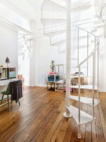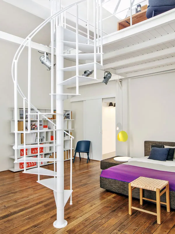 洗練された柔らかな曲線が際立つらせん階段。優雅さの中に工業的な雰囲気も持ったミニマルデザイン。